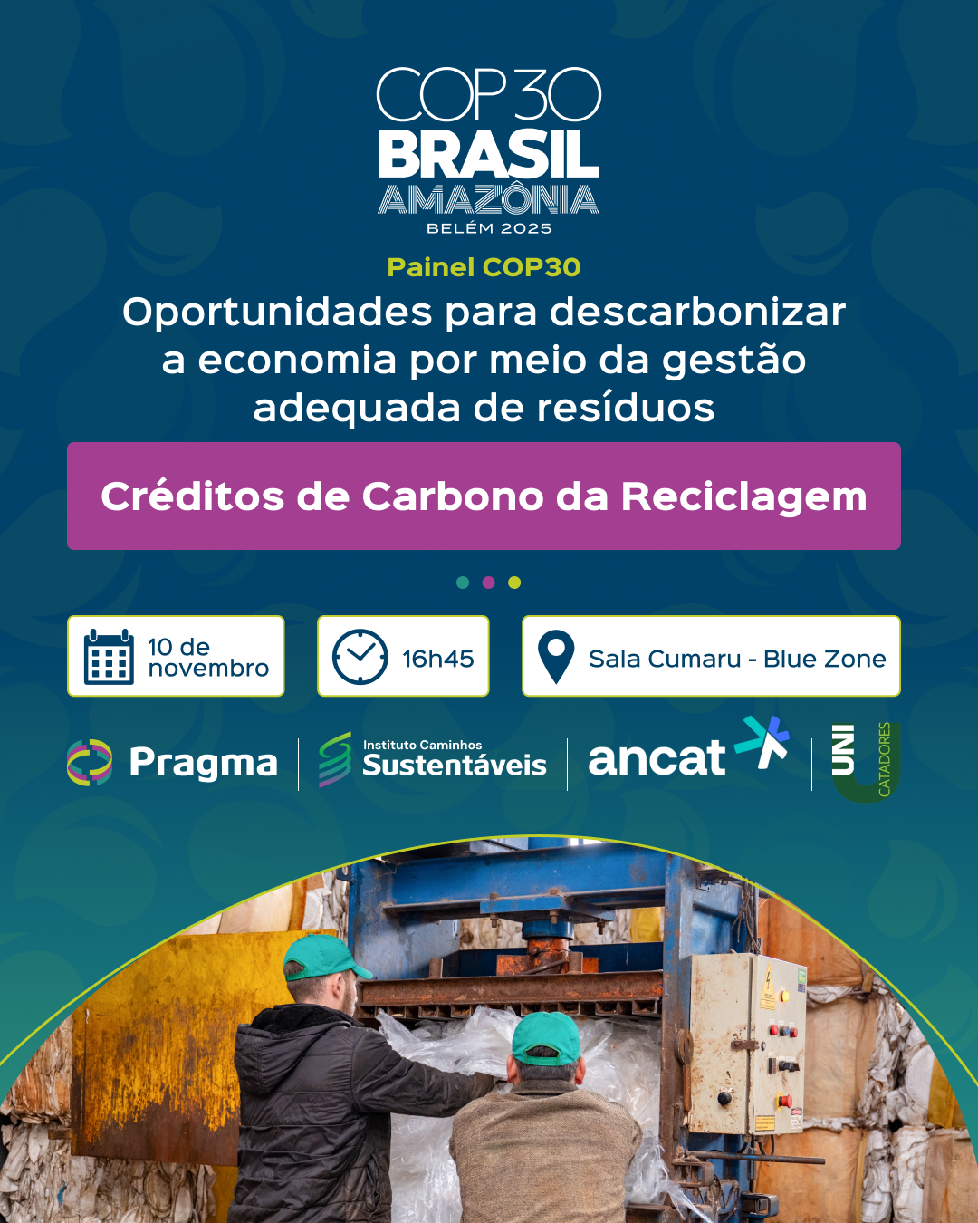A COP 30 irá começar na próxima segunda-feira, 10 de novembro, em Belém do Pará. E neste mesmo dia, o Instituto Caminhos Sustentáveis (ICS), juntamente com a Pragma, a Associação Nacional dos Catadores e Catadoras de Materiais Recicláveis e Unicatadores, vão liderar o painel “Oportunidades para descarbonizar a economia por meio da gestão adequada de resíduos – Créditos de Carbono da Reciclagem”, que começa às 16h45, no Auditório Cumaru, localizado na Área Azul do evento. O painel foi um dos selecionados pelo pelo Ministério do Meio Ambiente e Mudança do Clima.
